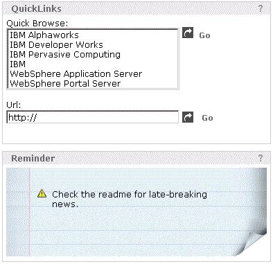 . См. рис 1 с примером страницы портала с двумя видимыми компонентами. Каждый видимый компонент называется портлетом. В этом примере, один портлет позволяет пользователю отправиться по указанному URL; другой предоставляет пользователю текст с напоминанием.
