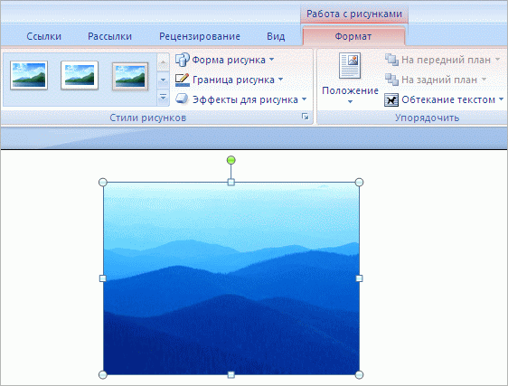 Но после вставки рисунка в документ Word появляется вкладка Работа с рисунками