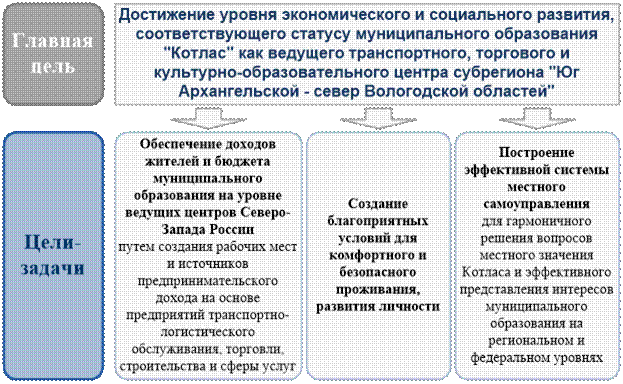 Достижение уровня экономического и социального развития, соответствующего статусу муниципального образования "Котлас" как ведущего транспортного, торгового и культурно-образовательного центра субрегиона "Юг Архангельской – север Вологодской областей"