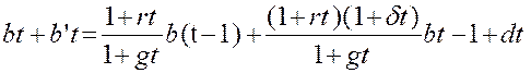 В данном выражении не отражается валютная структура долга. Чтобы учесть динамику внутреннего и внешнего государственного долга, рассмотрим следующее уравнение(2): где: b’t – внешний долг к концу периода Bt оцененный по обменному курсу рубля к доллару (в % к ВВП);