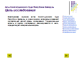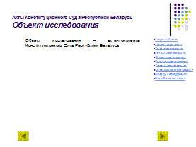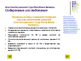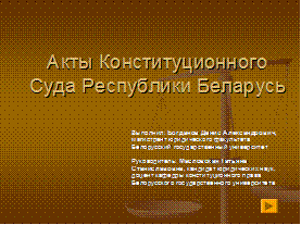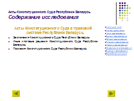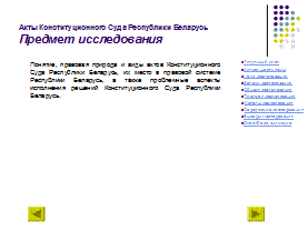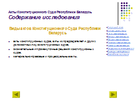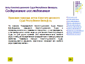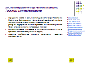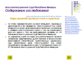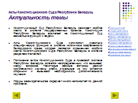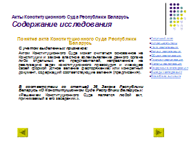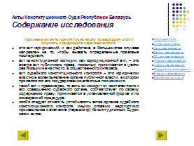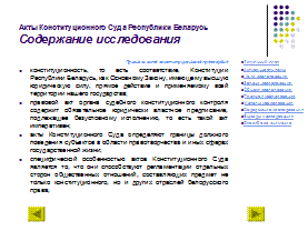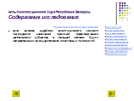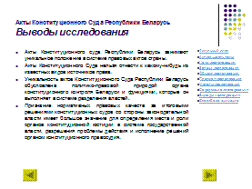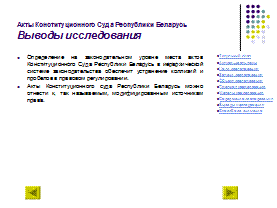 1. http://www.kc.gov.by/ – сайт Конституционного Суда Республики Беларусь. Позволяет оперативно отслеживать информацию о новых правовых актах, принимаемых данным органом, представляет сведения о периодическом издании Конституционного Суда и содержащихся в нем материалах.