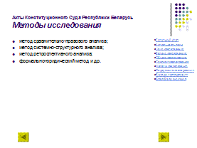 В качестве основных методов исследования, которые использовались при подготовке данной работы, можно назвать такие общенаучные методы исследования как эксперимент (проверка эффективности правовой информатизации), сравнительный анализ (определение положительных сторон и преимуществ правовой информатизации в Республике Беларусь по сравнению с другими государствами), индукция (исследование конкретного примера использования справочной правовой системы).