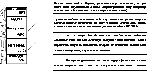 Вступлением к теме могут быть сценки, примеры, пантомимы. Целью вступления есть успокоить после весёлых игр и настроить людей на тему общения. Изложение темы - это проповедь без проповеди (изложите тему так, чтобы это не было загрузкой, не используйте христианских клише и ваших излюбленных выражений). Как вы отнесётесь к подготовке и изложению темы, так к ней будут относиться слушающие.