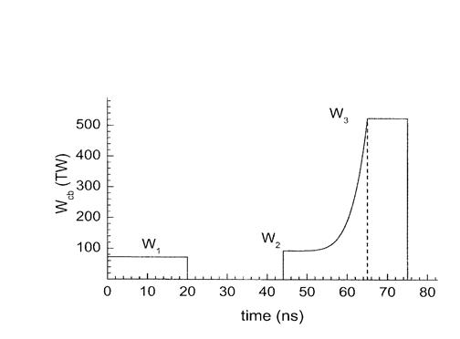 Гц, обеспечивая практически однородное по азимуту выделение энергии в кольцевом слое (абсорбере) оболочки. Мощность пучка профилируется по времени так, чтобы энерговыделение в абсорбере обеспечило безударное сжатие топлива [10]. При достижении максимального сжатия DT-топливо поджигается сверхмощным пучком, сфокусированным на торец DT-шнура (режим быстрого поджига). Мишени инжектируются в камеру, где происходит микровзрыв, с частотой 2 Гц.
