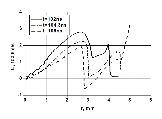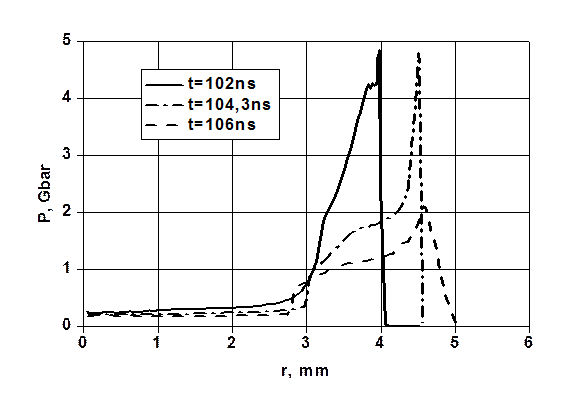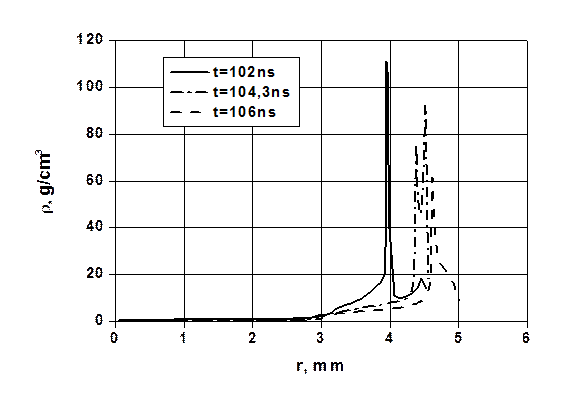 при расчете разлета мишени отвечают условиям, которые сформировались в момент выхода ударной волны на поверхность мишени, т.е. в момент 104,3 нс.