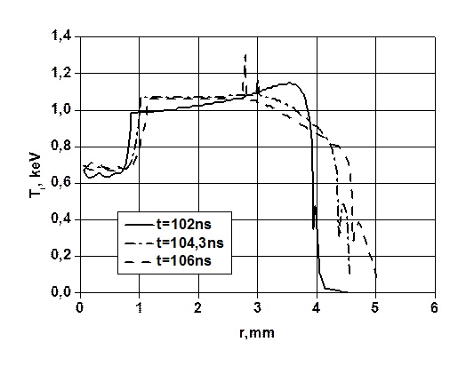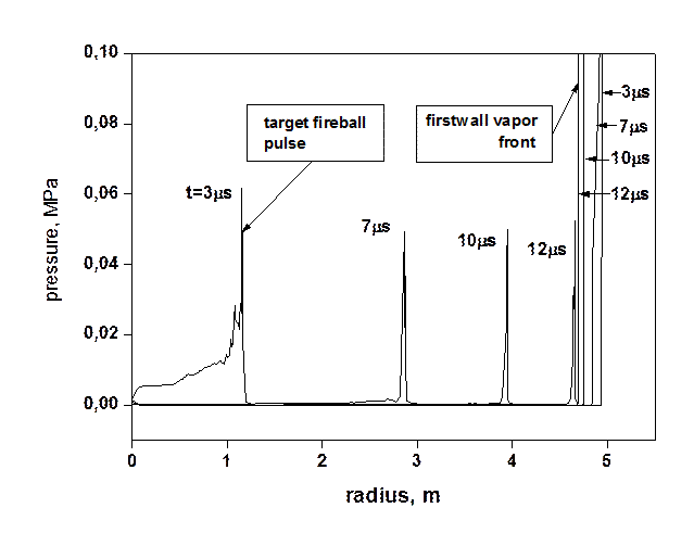 Следует подчеркнуть, что представляемые в данной работе расчеты носят теоретический характер и не имеют верификации в части горения термоядерной мишени и, соответственно, отклика камеры на микровзрыв, поскольку требуемые параметры драйвера в настоящее время не достижимы. Кроме того, численный расчет горения и разлета носит качественный характер и не является инженерным, учитывающим реальную геометрию объекта. Целью работы было проведение сквозного расчета горения мишени, ее разлета и взаимодействия продуктов микровзрыва с материалом первой стенки камеры в идеальной математической постановке задачи, но с возможно более полной физической системой уравнений. Полученные результаты показывают, что такой расчет может быть корректно проведен. Это позволяет надеяться и на возможность проведения таких расчетов в реальной геометрии.