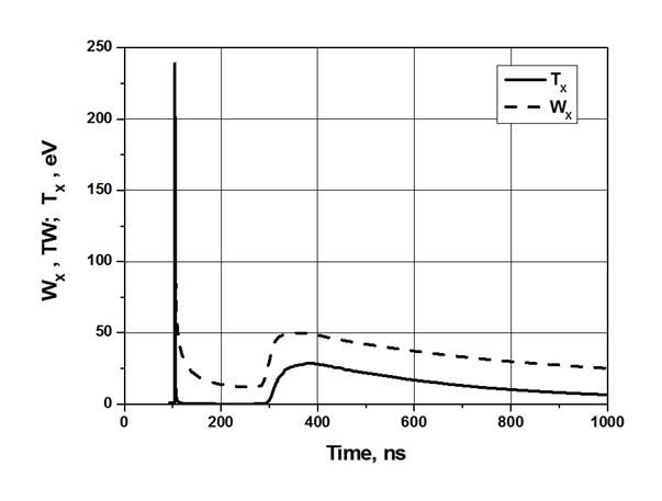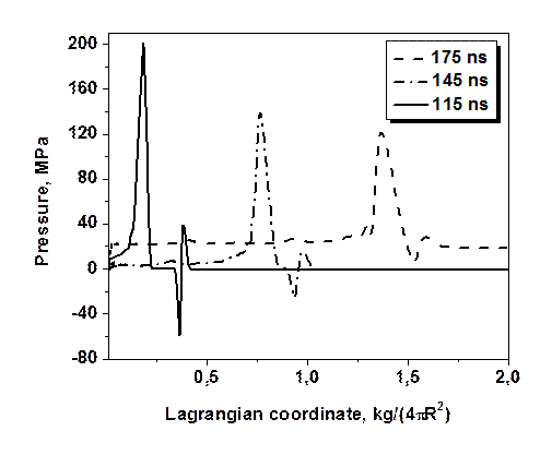 Ранее в работе [23] был рассчитано воздействие на пленку пред-импульса рентгеновского излучения и потока нейтронов. Расчет показал, что в жидкой пленке от пред-импульса возникает резкий пик давления – до 200 МПа (Рис. 13). При этом ударная волна распространяется по пленке, постепенно теряя амплитуду.
