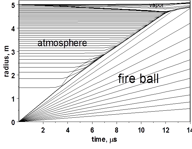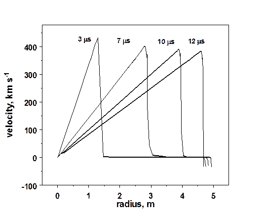 Распределение скорости в фаерболе практически линейное, его граница движется с почти постоянной скоростью порядка 400 км/с. В результате по атмосфере камеры распространяется ударная волна (Рис. 15). Поскольку масса атмосферы существенно меньше массы фаербола, траектории частиц атмосферы практически сливаются с линией фронта скачка давления.