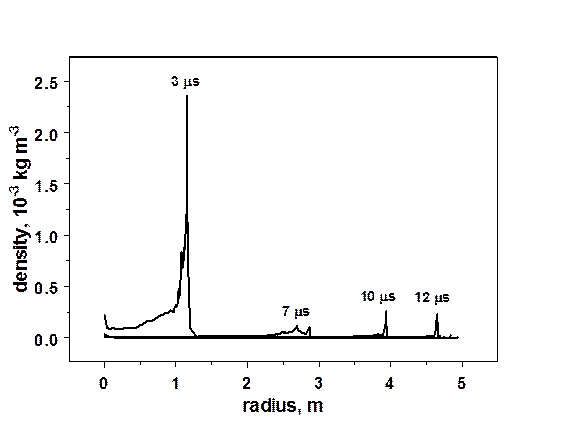 Радиальные распределения скорости и плотности вещества фаербола в различные моменты времени представлены на графиках Рис. 16 и 17. Распределение скорости в файерболе практически линейно. Вещество атмосферы ускоряется в ударных волнах, возникающих в результате расширения фаербола и испаряющейся пленки. Максимальная плотность в импульсе, распространяющемся от центра камеры, падает от 105