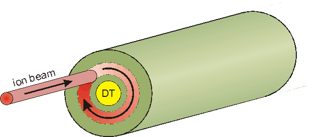 В работах [2, 7, 8] предполагается, что можно построить мощный тяжелоионный ускоритель, позволяющий ускорять однозарядные ионы тяжелых металлов до энергии ~500 МэВ/на нуклон (~100 ГэВ/на ядро). Пучок ионов облучает с торца цилиндрическую мишень [2, 9], на оси которой находится термоядерное топливо (эквимолярная смесь DT), окруженное свинцовой оболочкой (Рис. 1). Пятно пучка перемещается по торцу мишени по окружности с частотой ~109