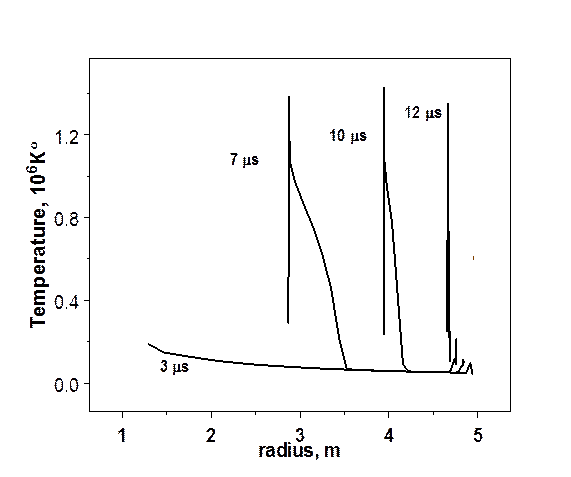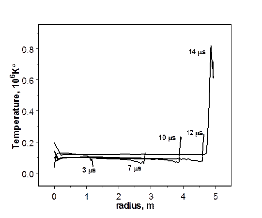 Диаграмма Рис. 14 предсталяет результат совместного расчета процессов разлета мишени, распространения ударной волны по атмосфере камеры и испарения внутрь камеры защитной жидкой пленки первой стенки. Видно, что столкновение двух встречных фронтов – фаербола и ионизованного пара – происходит приблизительно через 12 мкс после взрыва мишени на расстоянии около 40 см от стенки. После столкновения паровой слой нагревается до 106