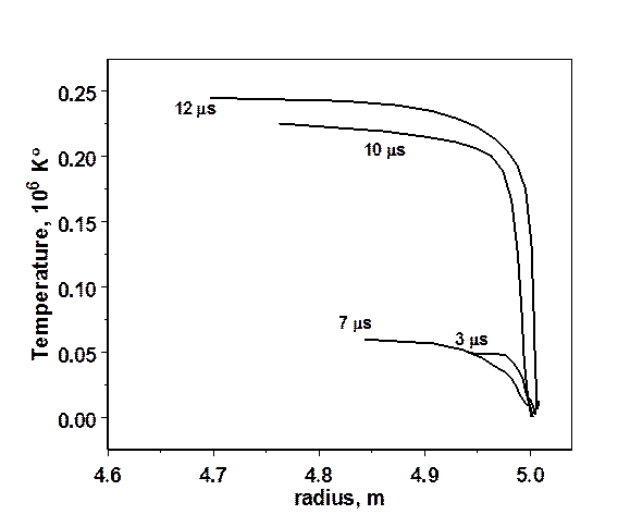Испаренный слой защитной жидкой пленки расширяется внутрь камеры, одновременно нагреваясь излучением, идущим из фаербола. На Рис. 20 видно, что с ростом времени «хвосты» ионизованного пара удаляются от первой стенки, одновременно с этим нагреваясь.