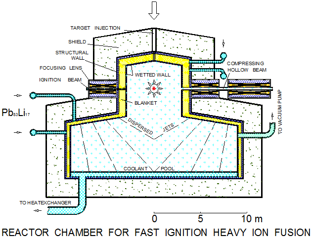 Для предложенного сочетания драйвера и мишени в работах [1, 5, 6] представлены общая схема реакторной камеры (включая первую стенку и бланкет) и тепловая схема электростанции. Первая стенка камеры выполнена из пористого карбида кремния. Через поры в камеру просачивается жидкометаллический теплоноситель (эвтектика свинец-литий), образующий защитную пленку. В нижней части камеры сделана конденсационная полость, в которую тот же теплоноситель инжектируется в виде спрэя для ускорения процесса конденсации вещества, испаренного в результате микровзрыва.