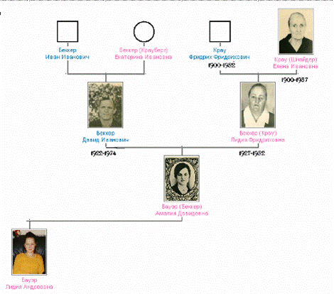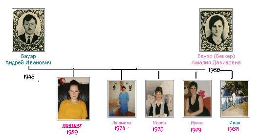 Мне было интересно узнать на кого все - таки я похожа, изучив фотографии предков я поняла, что от Бауэров у меня цвет глаз, а от Беккеров цвет волос и форма ушей. Часто выступаю в концертах за школу и район, говорят у меня голос похож на голос моей прабабушки Паулины. Назвали меня в честь бабушки Лидии Фридриховны Беккер.