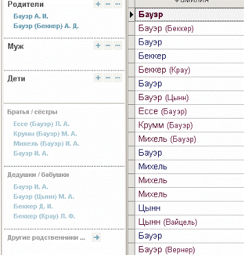 Выбрав любую персону из «списка персон», можно увидеть в левой части окна программы родителей, дедушек, бабушек, сестер и братьев каждой персоны.