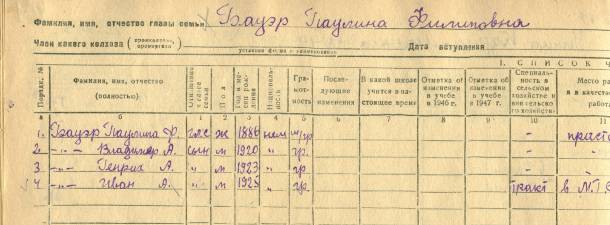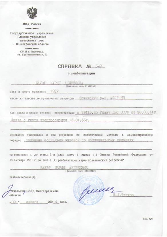 (дочь Андрея и Елизаветы) является моей бабушкой. О ней известно, что она родилась 5.06.1927 года в Поволжье, селе Гуссенбах. Закончила 5 классов, Работала на разных работах. В 1941 году вместе с мамой и братом была как и многие другие немцы выслана в село Привальное