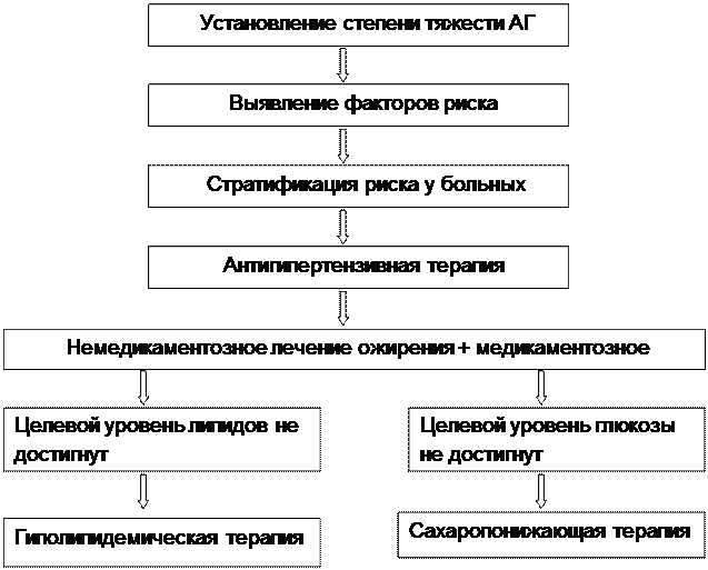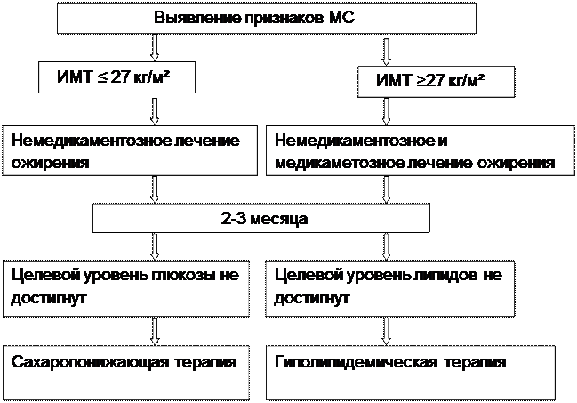 Использование предложенных алгоритмов лечения больных с МС позволит оптимизировать их лечение. Влияя только на один из компонентов МС, можно добиться заметного улучшения за счет компенсации изменений в других звеньях его патогенеза. Например, снижение веса вызовет снижение АД и нормализацию метаболических нарушений, а гипогликемическая терапия наряду с компенсацией углеводного обмена приведет к снижению АД и улучшению показателей липидного обмена. Гиполипидемическая терапия может способствовать повышению чувствительности тканей к инсулину и улучшению показателей углеводного обмена. Грамотно подобранная гипотензивная терапия помимо основного действия нередко улучшает показатели углеводного, липидного обмена и повышает чувствительность тканей к инсулину. Эффективность лечения во многом зависит от глубокого понимания врачом природы МС и знания основных и дополнительных механизмов действия лекарственных препаратов, применяемых для его лечения. Разработанный и предложенный алгоритм и критерии диагностики МС с учетом уровня учреждений системы здравоохранения России позволят повысить выявляемость МС у населения, что в свою очередь при своевременной и адекватно подобранной терапии приведет к значительному снижению риска развития сердечно-сосудистых осложнений, СД 2 типа и улучшению качества жизни у больных.