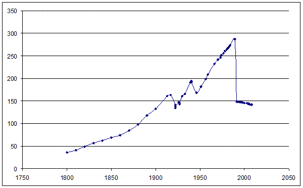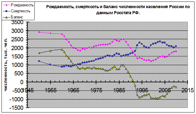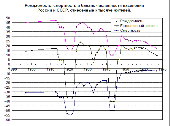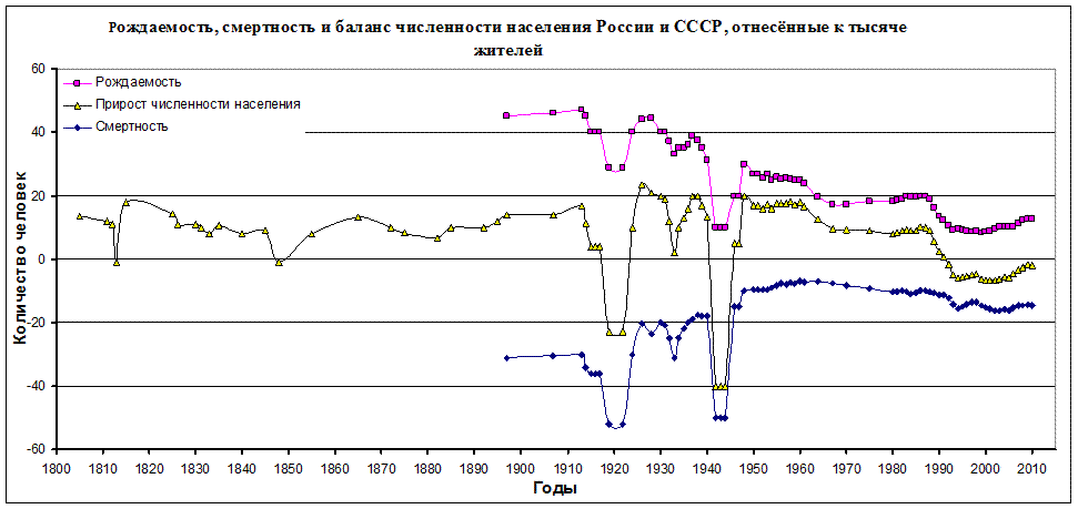 Демографические показатели, такие как численность населения, число рождений, смертей и их разность в абсолютном и относительном (на 1000 жителей) виде представлены для императорской России, Советского Союза и Российской Федерации в период с 1800 по 2010 годы.