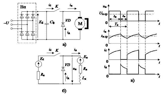 . Рис.1. Система импульсного регулирования напряжения на якоре ДПТ: а - упрощённая схема силовой части; б - её эквивалентная схема замещения; в - диаграммы изменения напряжения на якоре двигателя и токов: якоря, потребляемого от источника и в обратном диоде