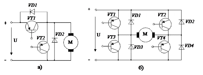 Упрощённая схема силовой части системы импульсного регулирования напряжения на якоре двигателя постоянного тока представлена на рис. 1, а