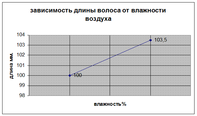 При исследовании зависимости длины волоса от влажности необходимо соблюдение температурного режима. Длина волоса зависит также и от температуры окружающей среды. При одинаковых температурах, но различной влажности приходится определять длину. Поэтому установка для определения влажности воздуха должна работать постоянно. Все данные в таблице содержат наблюдение двух месяцев. В итоге знание этой зависимости позволило построить волосяной гигрометр. Данный прибор показывает непосредственно влажность, минуя дополнительные вычисления.
