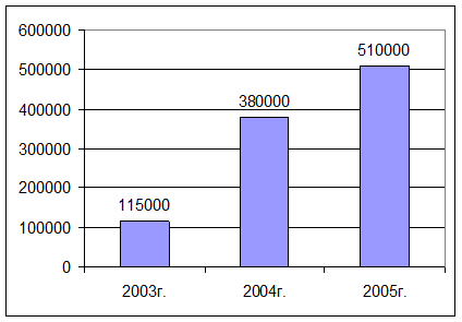 За 2003 – 2005гг. выпуск пластиковых карт банком вырос на 395 тыс.штук или на 343 % (см. рис.2).