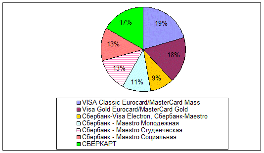 Как показывают данные (см. рис.2), наибольший удельный вес в общем, объеме выпуска пластиковых карт занимают карты VISA Classic Eurocard/MasterCard Mass (19%), Visa Gold Eurocard/MasterCard Gold (18 %) и СБЕРКАРТ (17%).