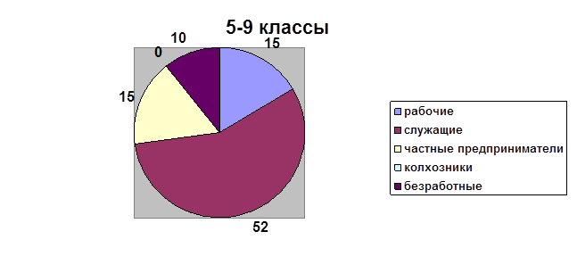 Среди учащихся школы нет детей, находящихся под опекой. Социальный состав учащихся разнообразен. В школе учатся дети служащих, рабочих, колхозников, пенсионеров, безработных. (Диаграмма 2,3,4)