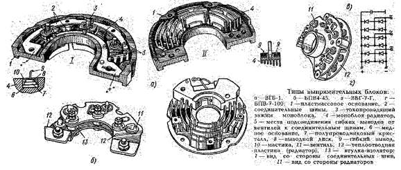 . Отрицательная шина выпрямительного блока соединена с корпусом генератора. В более поздних конструкциях выпрямительных блоков БПВ-4-45 (рис. 4,б