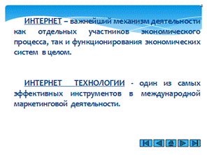. Производители обязаны ориентироваться на мнение индивидуумов для того, чтобы оставаться конкурентными как на внутреннем, так и на международном рынке и поддерживать лояльности каждого потребителя. Именно с этой точки зрения, Интернет-технологии являются одним из самых эффективных инструментов международной маркетинговой деятельности. Маркетинг позволяет понять клиента, увидеть цель и достичь ее. Таким образом, именно маркетинг, вооруженный Интернет-технологиями, позволяет наиболее точно, эффективно, индивидуально и гибко отреагировать на быстро меняющиеся нужды потребителей, а также бизнес-партнеров, сохраняя позиции компании в системе мирохозяйственных связей.