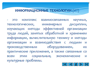 Согласно определению, принятому ЮНЕСКО, информационные технологии (ИТ) - это комплекс взаимосвязанных научных, технологических, инженерных дисциплин, изучающих методы эффективной организации труда людей, занятых обработкой и хранением информации, вычислительную технику и методы организации и взаимодействия с людьми и производственным оборудованием, их практические приложения, а также связанные со всем этим социальные, экономические и культурные проблемы.