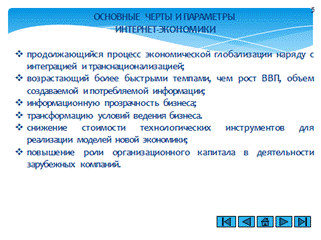 Интернет-экономика представляет собой сетевую системно организованную многоуровневую структуру взаимоотношений в Интернете между экономическими агентами, которая включает в себя индустрию создания новых информационных технологий и информационных продуктов, телекоммуникационные и провайдерские услуги, электронный бизнес, электронные рынки, и другие составляющие. Важнейшим следствием внедрения Интернет-технологий в мировую экономику стало формирование глобальных рынков - финансового, товарного и рынка услуг труда.