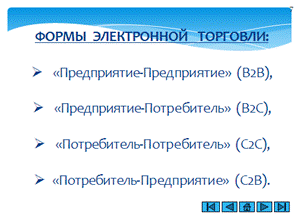 В настоящее время существуют четыре основных формы электронной торговли «Предприятие-Предприятие» (В2В), «Предприятие-Потребитель» (В2С), «Потребитель-Потребитель» (С2С) и «Потребитель-Предприятие» (С2В).