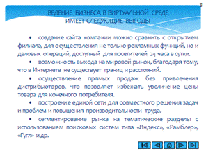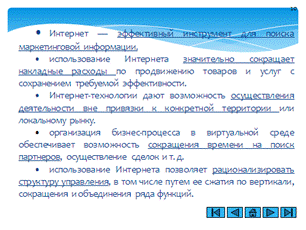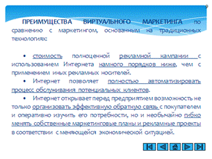 Таким образом, использование Интернет-технологий в маркетинге позволяет организовать эффективную модель функционирования предприятия, что обеспечивает не только стабильное развитие компании, но и дает ряд преимуществ перед другими агентами рынка.