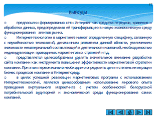 Дальнейшая интеграция Беларуси в мировое сообщество открывает границы для проникновения новых участников на внутренний рынок. Именно использование Интернет-технологий в маркетинговой деятельности позволит белорусским предприятиям укрепить свои позиции на внутреннем рынке, а также заявить о себе на внешнем рынке, с перспективой выхода к новой потребительской аудитории. Поэтому возникает необходимость в систематизации знаний зарубежного опыта, касающихся использования Интернет-технологий в маркетинговой деятельности, а также в развитии методических положений с целью их дальнейшего использования в практике белорусских предприятий.