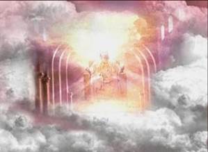 Затем мне было позволено увидеть за сухой землёй, весь путь в небеса. Там, бок о бок касаясь основаниями, были две гигантские горы. Я не знаю их высоту, но они были очень, очень высокими. Я подтянулась поближе к горам и обнаружила, что они были сделаны из твёрдого золота – золота такого чистого, оно было прозрачное. Чрез горы и за ними я увидела яркий белый свет, и этот свет увеличивался, чтобы наполнить вселенную. Я почувствовала, что это была основа, на которой сидели небеса.