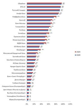 Как видно из графикарасстановка сил среди основных игроков банковского бизнеса значительно не поменялась. По сравнению с итогами прошедшего года (4 квартал 2008 года), ко 2 кварталу 2009 года многие организации даже сумели увеличить уровень знания о себе. Самый значительный «скачок» наблюдался у «Райффайзенбанка»: если в конце 2008 года 74% участников исследования указали, что знают этот банк, то по итогам 2 квартала 2009 года уровень его известности увеличился еще на 8 процентных пунктов, что является хорошим результатом. Судя по наблюдающейся динамике, за исследуемый период практически все банки сумели в той или иной степени увеличить свою известность среди населения.13