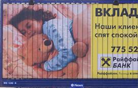 Хочется несколько слов сказать о рекламе «Райффайзен банка» в период кризиса 2008 года. Если до кризиса реклама банков носила неинтересный, «серый» характер, то при наступлении кризиса банки поняли, что надо создавать такую рекламу, которая сможет предупредить панику среди клиентов и привлечь новых клиентов. Банки теперь ориентировались на создание эмоциональной, креативной рекламы, которая имела бы большое воздействие на потребителя. Рассмотрим рекламу «Райффайзен Банка» в период кризиса, вот два рекламных щита банка: