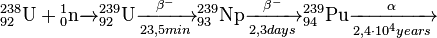 Продукты деления имеют ядра со всё ещё избыточным количеством нейтронов по сравнению со стабильными ядрами в той же области массовых чисел и являются таким образом β-радиоактивными, каждое из них служит началом серии β−превращений, заканчивающихся только при достижении стабильного состояния. Ядра одной серии составляют так называемую цепочку распада, состоящую в среднем из трёх β−переходов, скорость которых зависит от избытка нейтронов, уменьшается по мере приближения к стабильному состоянию и намного меньше рассмотренных выше стадий процесса деления. β−распад сопровождается испусканием антинейтрино.