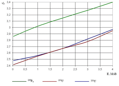 Зависимость среднего числа нейтронов, испускаемых при делении от энергии нейтронов, вызывающих деление для различных ядер