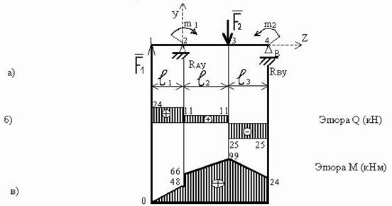 По данным задачи 2 для двухопорной балки построить эпоры поперечных сил Qу и изгибающих моментов Мх
