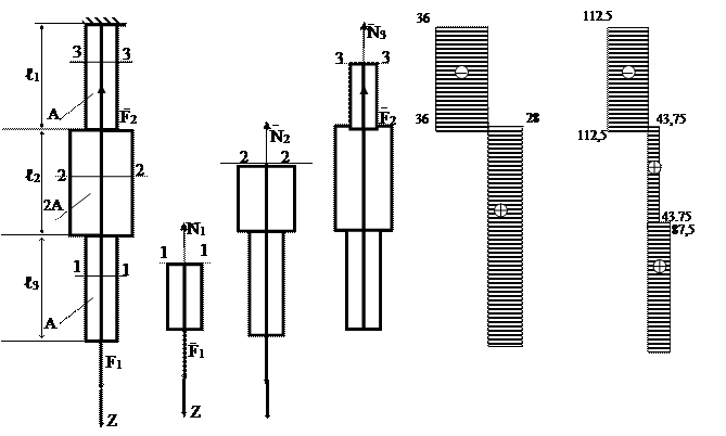 2 Разбиваем брус на участки, границы которых определяются сечениями, где изменяется площадь поперечного сечения или приложены внешние силы. На каждом из участков проводим характерные сечения 1-1, 2-2, 3-3. С помощью метода сечений определяем продольные силы на каждом из участков бруса: мысленно рассекаем брус в пределах первого участка сечения 1-1, отбрасываем верхнюю часть бруса и заменяем ее действие продольной силой N1