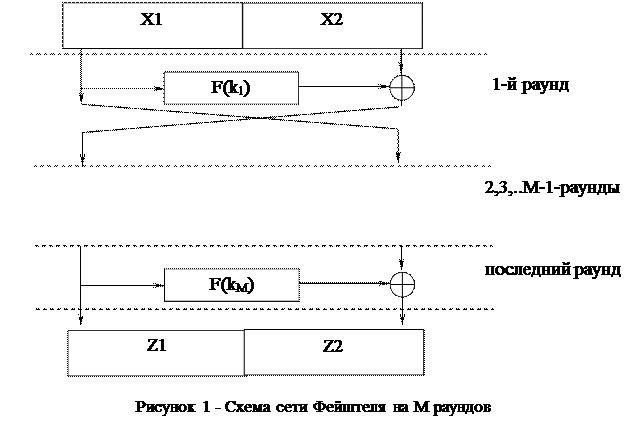В качестве примера криптографических сетей можно привести SP-сети, содержащие в каждом раунде два слоя – подстановки (substitution), в котором обычно используются обратимые операции преобразования над шифруемым блоком и материалом ключа, и перестановки (permutation), в котором происходит перестановка бит внутри блока. Однако самой популярной сегодня является сеть Фейштеля, схема которой представлена на рис.1.