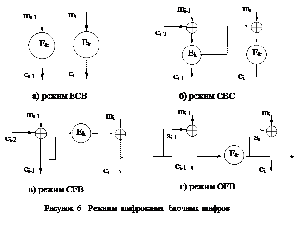 Преобразования Encrypt и Decrypt трактуют блоки открытого и зашифрованного текста как целые числа и выполняют над ними ряд арифметических либо логических действий, основная задача которых – тщательно «перемешать» биты блока открытого текста между собой, а также связать их с битами используемого ключа шифрования для формирования блока закрытого текста. При этом для блочного шифра несущественен тип преобразуемой информации, он разбивает ее на блоки определенного размера, интерпретирует эти блоки как целые числа в диапазоне [0..2k