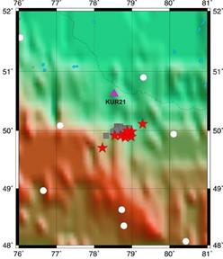Треугольник – центральная точка KUR21, кружки – землетрясения, звездочки - калибровочные химические взрывы, квадратики – карьерные взрывы.