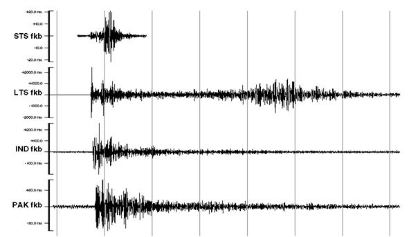 Для Пакистанского испытательного полигона Чагай рассматривался район, ограниченный координатами 26.5°-30.5° с. ш. и 61.8°-67.8°в.д. Было обработано 10 записей землетрясений с эпицентральными расстояниями от 2434 до 2840 км и магнитудами mb от 4.4 до 6.0 и двух ПЯВ 28 и 30.5.1998 г. на расстоянии 2670 км. На рисунке 7 показано расположение эпицентров событий из района полигонаЧагай, записи которых использовались для замеров. На рисунке 10 приведено распределение спектральных отношений S/P, разделения параметров не наблюдается KS/
