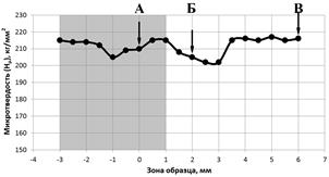 Место индентирования: А – зона сплавления (отм. «0»), Б – зона термического влияния (отм. «+2»), В – зона термического влияния (отм. «+6»). Серым выделена зона шва.