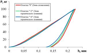 Первичные диаграммы индентирования шва стали ХНС-2 представлены на рисунке 5. Из диаграмм, построенных в координатах «Нагрузка (P