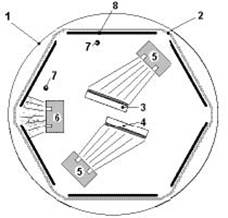 1 - вакуумная камера; 2 - вращающийся держатель подложки; 3, 4 - охлаждаемые водой мишени; 5 - источники ионно-лучевого распыления; 6 - источник ионного травления; 7 – компенсатор; 8 - подложки