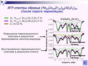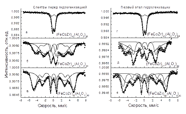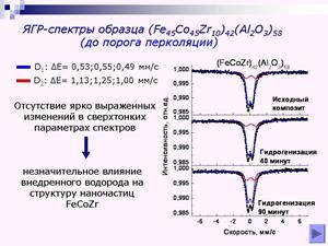 химически инертной примеси, в образцы вводился водород путем их гидрогенизации. Это позволило повлиять на структуру и свойства указанных композитов в диапазоне концентраций вблизи порога перколяции. Соответствующие изменения были зафиксированы методом ЯГР-спектроскопии и исследованы при помощи специального программного пакета MOSMOD, который является достаточно простым, но вместе с тем исчерпывающим средством обработки данных.